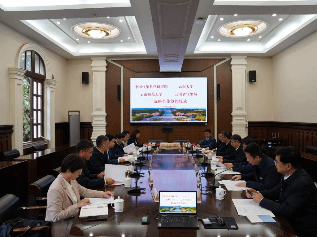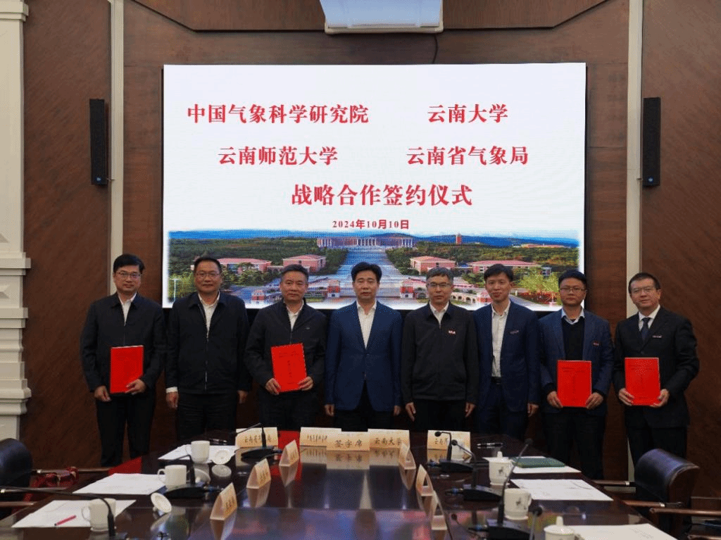 10月10日下午,中国气象科学研究院、云南省气象局、云南大学、8858cc永利唯一官方网四方战略合作协议签约仪式在云南大学举行。中国气象局党组成员、副局长熊绍员,中国气象局应急减灾与公共服务司司长王亚伟、科技与气候变化司副司长黄玮,中国气象科学研究院党委副书记、副院长张朝林,云南省气象局党组书记、局长尹晓毅,党组成员、副局长胡劲松,云南大学校长马文会,8858cc永利唯一官方网校长胡金明、副校长牛治亮出席签约仪式。仪式由云南大学副校长吴涧主持。