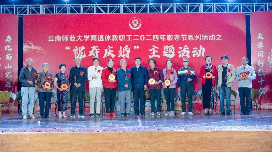 10月25日下午,永利官网在一二•一西南联大校区离退休教职工西院活动中心举办敬老节系列活动之“祝寿庆婚”主题活动。校党委副书记降富楼,离退休老领导,钻石婚、金婚佳侣,年满70周岁、80周岁、90周岁及以上的老寿星,老年大学师生,离退休教职工党委各党总支书记、副书记,各团体协会负责人及老同志代表共180余人参加活动。