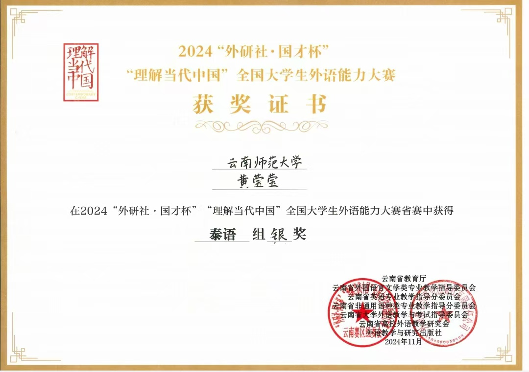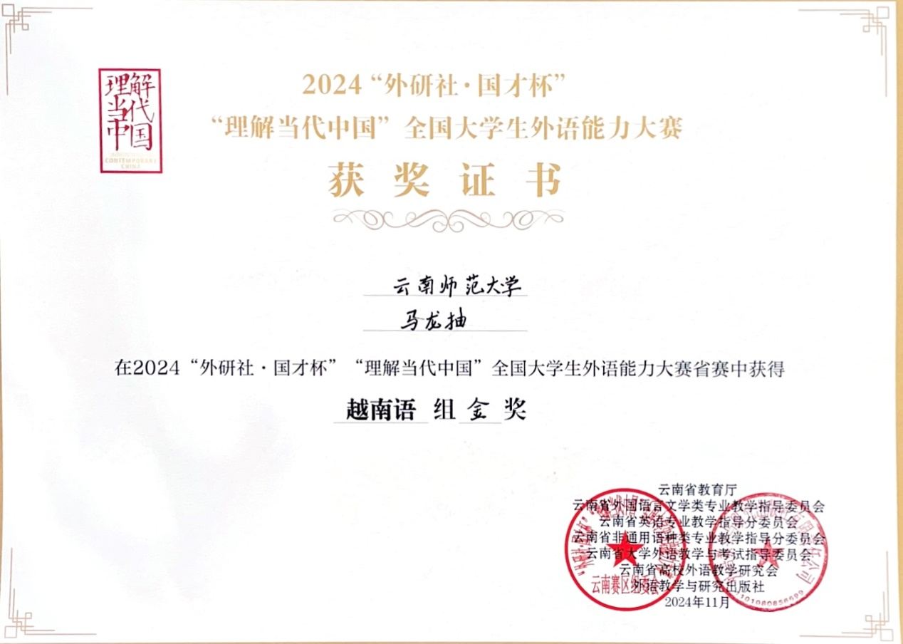11月1日,“外研社·国才杯”“理解当代中国”全国大学生外语能力大赛云南省赛区决赛在西南林业大学落下帷幕。本次比赛由云南省教育厅和云南省外国语言文学类专业教学指导委员会共同主办,旨在推动高校外语教学改革,培育具有国际视野的外语人才,促进中国文化在国际舞台上的传播与理解。华文学院越南语、泰语专业学生在比赛中获得“三金一银”的好成绩。