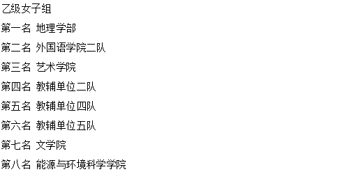 经过激烈角逐,甲级组数学学院一队获男队第一名,教辅单位三队(图书馆、心理中心)获女队第一名;乙级组艺术学院获男队第一名,地理学部获女队第一名(具体获奖名单附后)。