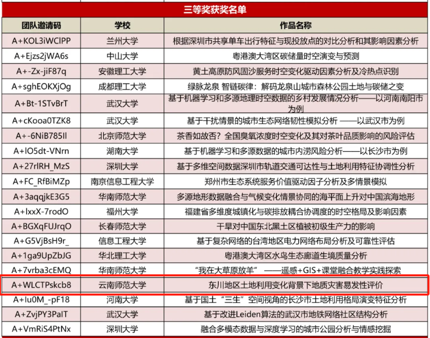 永利官网地理学部重视培养学生实践能力与创新意识,通过组织学生参与各级各类赛事,助力学生成长为具有国际视野和实践能力的复合型人才。此次获奖是参赛学生、指导教师共同努力的结果,展现了地理学部专业教育质量和科研水平,体现了学校长期坚持产学研结合和实践教学改革的成效。