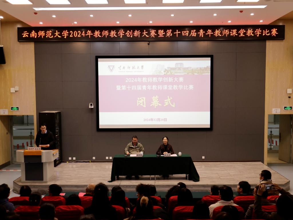 闭幕式上,云南华文学院梅潇尹老师代表参赛教师作交流发言,本科教学督导团团长毕先均教授和云南农业大学刘雅婷教授分别对青年赛道和非青年赛道比赛情况作点评,并提出改进意见和建议。校工会副主席王丽萍宣布比赛结果,教务处处长陈长瑶对本届比赛整体情况进行了总结。
