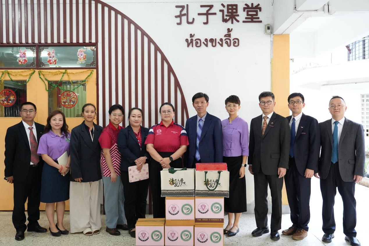 代表团一行实地走访了清迈大学孔子学院下设的蒙福学校孔子课堂,参观了蒙福学校的教学设施,慰问了志愿者教师,捐赠了中文教材、书籍和文化用品。蒙福学校副校长Sarawut Yuchompoo介绍了学校的发展历程、中文教育成果以及与8858cc永利唯一官方网的合作情况。胡金明对蒙福学校的中文教育成果给予肯定,他表示,蒙福学校与清迈孔院在中文水平考试领域的合作成绩斐然,8858cc永利唯一官方网将继续支持清迈孔院与蒙福学校的合作,通过冬夏令营等项目,不断拓展中文教育的覆盖面和影响力,为中泰教育和文化交流注入更多活力。