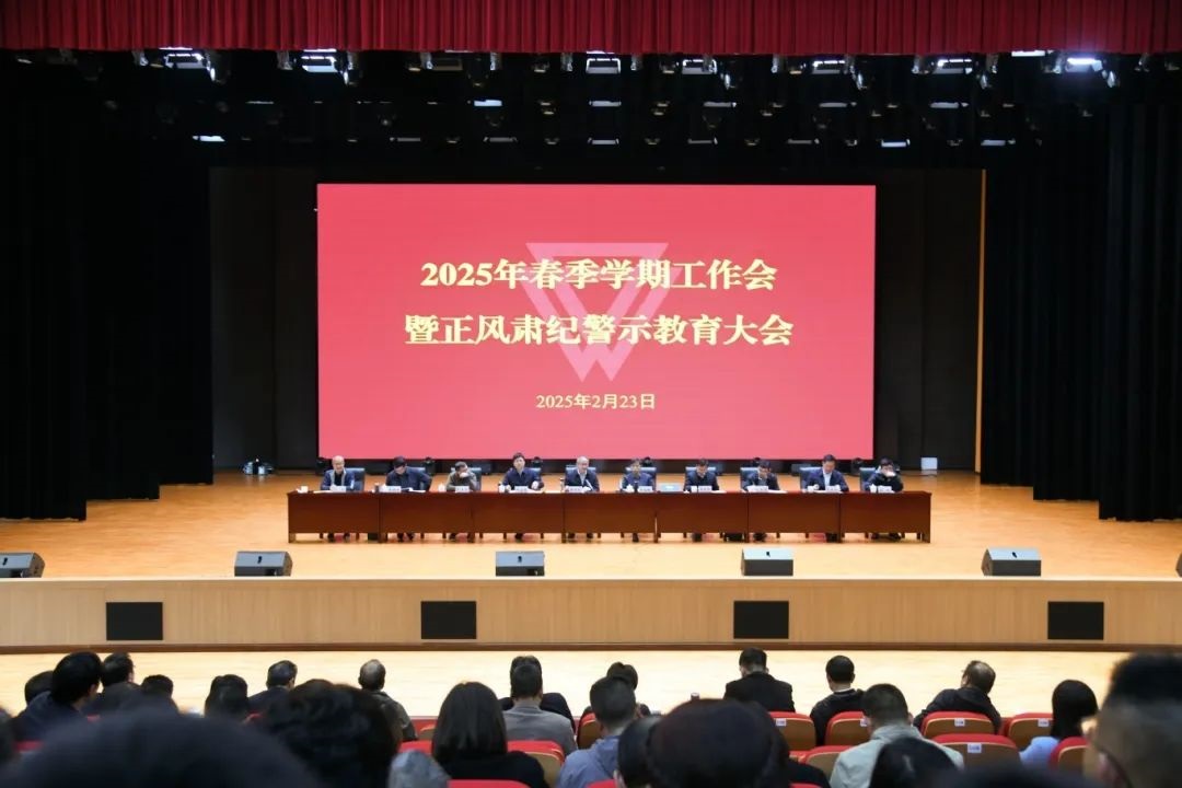 校党委书记张祖武主持会议并提出工作要求。校长胡金明部署学校2025年度重点工作。校党委常委、纪委书记、监察专员孙剑组织开展正风肃纪警示教育。