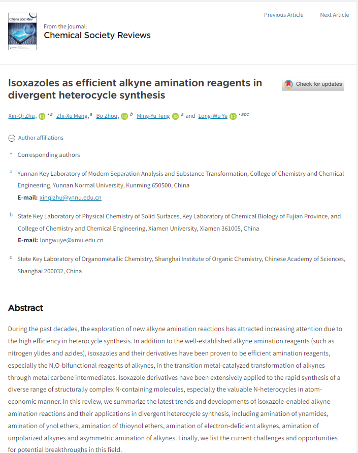近日,永利官网化学化工学院朱欣祺研究员、柔性引进高层次人才叶龙武教授等在国际期刊《Chemical Society Reviews》(影响因子40.4)上发表题为“Isoxazoles as efficient alkyne amination reagents in divergent heterocycle synthesis”的综述论文。第一作者兼通讯作者是学院高层次引进人才朱欣祺研究员,学院高层次柔性引进人才、厦门大学化学化工学院叶龙武教授为共同通讯作者,论文第二作者为学院2022届硕士研究生孟芷旭。据“Web of Science”检索发现,该论文是首次以8858cc永利唯一官方网为第一单位在《Chemical Society Reviews》发表的高水平综述论文,也是目前为止化学化工学院影响因子最高(IF=40.4)的论文。该工作得到了国家自然科学基金项目(22101238, 22125108, 22331004)的资助。
