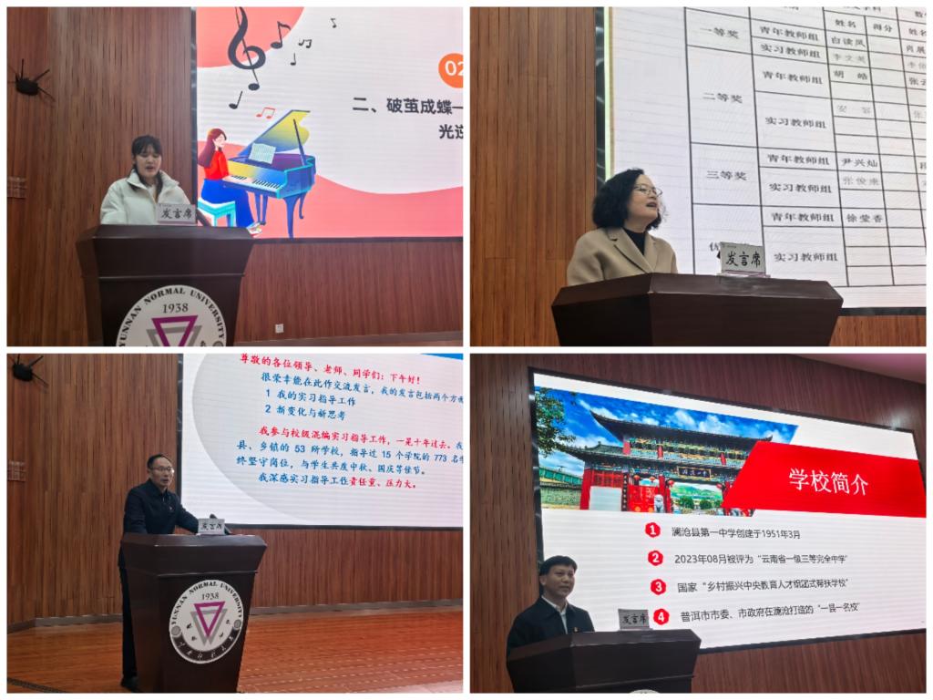 物理与电子信息学院实习工作教师蔡武德从精心准备、驻点管理、动员激励、总结反馈四个方面分享了实习指导工作的流程与经验。文学院实习指导教师成巧云围绕如何将课堂教学技能赛事元素有机融入实习实践活动进行了“以赛促成长”的专题交流。优秀实习基地代表澜沧拉祜族自治县第一中学副校长彭正华介绍了边疆基地在规划准备、师资队伍培育、实践成果共享、实习就业联动等方面的工作,分享了基地共建共管经验。优秀实习生代表张家榕分享了她在云县二中的教育实习感悟。教育学部老师茶世俊对“云南基础教育大调研”的相关工作进行了培训和指导。