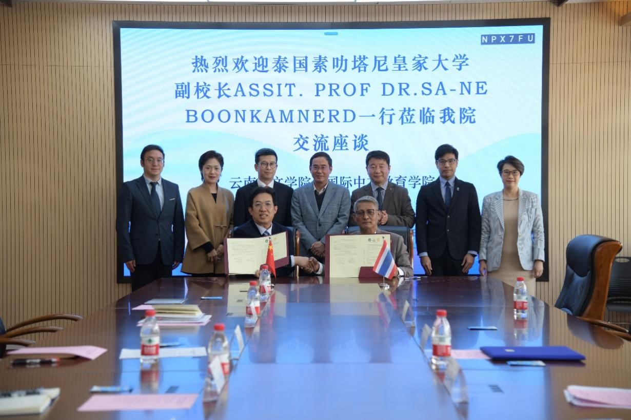 3月12日上午,泰国素叻他尼皇家大学副校长兼人文社会学院院长萨内·汶坎纳德一行访问永利官网。双方围绕中泰教育合作举行座谈并签署新一轮“2+2”中文人才培养合作协议。永利官网副校长陈飞出席会议并致辞,萨内·汶坎纳德和云南华文学院院长王秀成签署协议,对外合作交流处处长杨叶华等参加座谈。