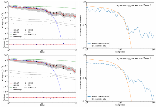 ALP是为解决量子色动力学(QCD)中的强CP(Charge-Parity,电荷宇称: 用于描述粒子在电荷共轭对称运算下的行为)问题而提出的一类超轻、伪标量粒子,被认为是暗物质的重要候选体之一。ALP与光子的耦合特性表明二者在磁场中能发生振荡,这一现象能在高能伽马射线能谱中留下特征性起伏,从而避免传统物理预测的TeV光子严重吸收问题。该论文详细分析了光子- ALP 束从活动星系核喷流到地球的传播过程,估算了高能光子的存活概率。通过考虑了包括喷流内的螺旋磁场、环形磁场,星系团中的高斯湍流场、结构空腔磁场等多种不同的磁场结构,发现ALP振荡模型可使TeV伽玛射线光子存活概率提高2-3个量级,抑制了河外星系背景光(EBL)吸收导致的能谱截断效应(图1)。该研究结果不仅为TeV源能谱异常现象提供了新的物理解释,还为国家重大科研基础设施-高海拔宇宙线观测站(LHAASO)搜寻ALP提供理论基础,同时也对深入理解宇宙中的物质成分和相互作用,尤其是暗物质探测具有重要意义。