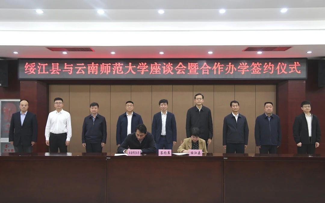 4月12日,校长胡金明一行在绥江县与绥江县人民政府举行座谈会暨合作办学签约仪式。昭通市副市长马洪旗,昭通市教育体育局党组书记、局长周世碧,绥江县委书记王启仁,绥江县委副书记、县长陈皓霁及县直部门领导,永利官网校长办公室、基础教育集团办公室等相关部门负责人参加签约仪式。仪式由王启仁主持。
