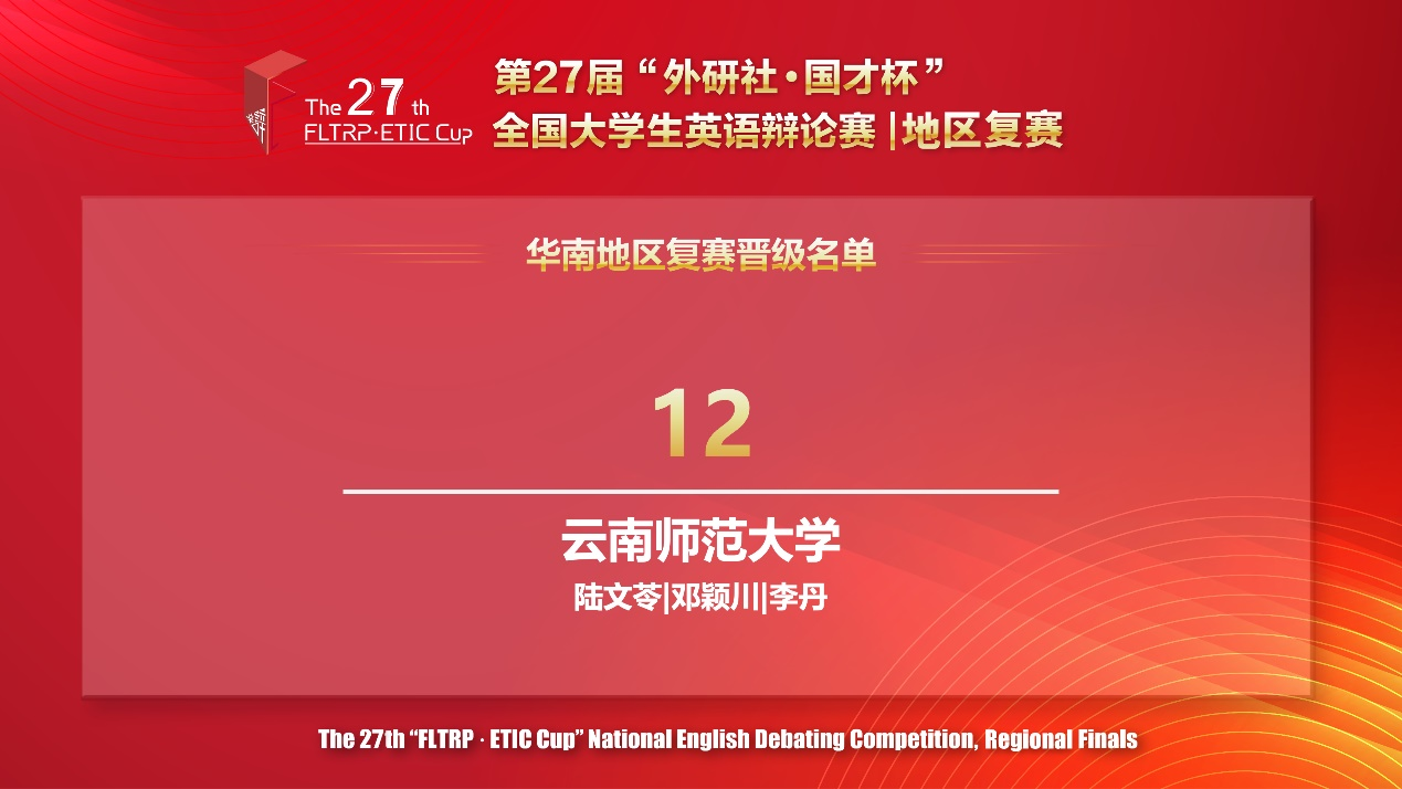 4月12日至13日, 第27届“外研社·国才杯”全国大学生英语辩论赛华南地区复赛在线上举行。永利官网2021级英语专业本科生邓颖川、李丹同学组成的英辩代表队,在外国语学院陆文苓老师的精心指导下,与来自福建、广东、广西、港澳台、湖北、湖南、江西、云南、贵州、海南等高校128支队伍同场比拼,经过五轮积分循环赛的竞争,脱颖而出,以全场排名12,云南省排名第1的优异成绩,荣获华南赛区金奖,成功晋级全国决赛,在此项赛事中实现重要突破,是永利官网选手首次入围国赛。