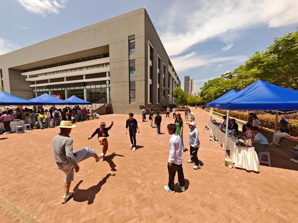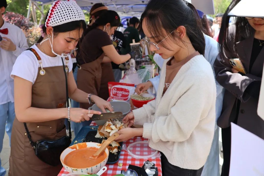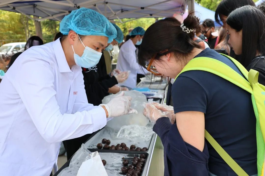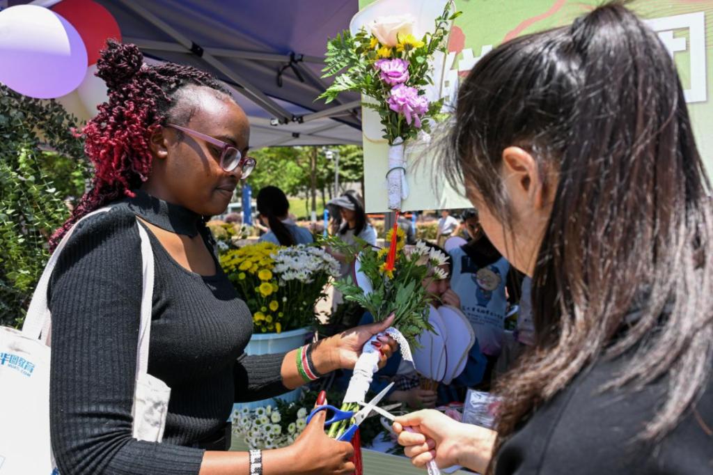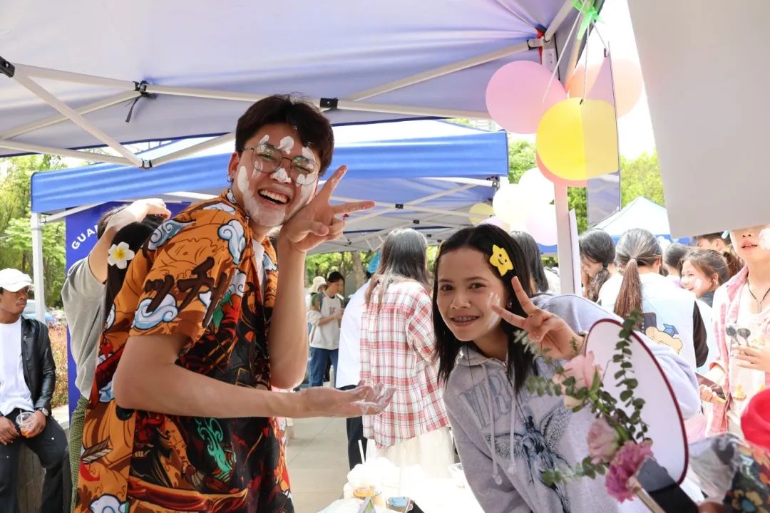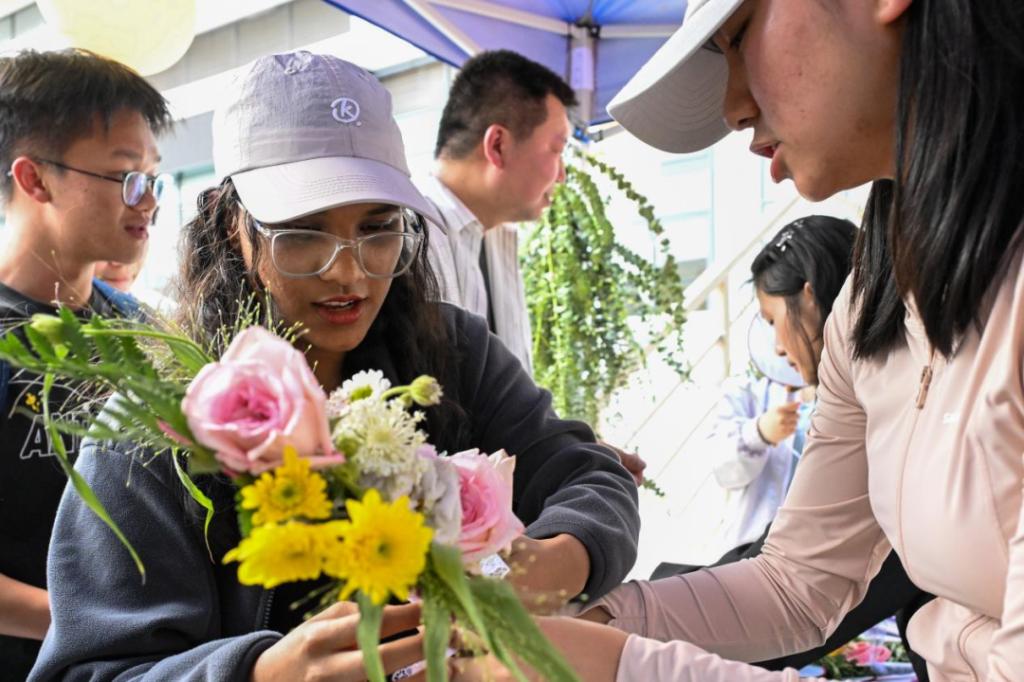 “解密属于中文的礼物”是本次“国际中文日”庆祝活动的重头戏,通过“来自世界的礼物”“来自云南的礼物”“来自味蕾的礼物”“来自自然的礼物”四大主题展区,集中展示了中国与周边国家的特色文化。鲜花团扇、花环头饰制作活动让参与者们在“云花”的装饰下“各美其美、美美与共”,缅甸藤球和中式鸡毛毽活动让中外学生共练“脚上功夫”,豆花米线、烤鸭、宋丹、芒果糯米饭和养生姜茶等各类中外美食更是让师生们大饱口福。