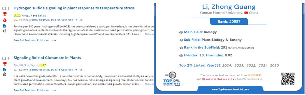 美国斯坦福大学和爱思唯尔数据库发布2024年度全球前2%顶尖科学家榜单,永利官网李忠光教授连续5年(2020-2024年)入选全球前2%顶尖科学家“年度科学影响力排行榜”(Single year impact)和“终身科学影响力排行榜”(Whole career impact)。2024年度,全球入选前2%的顶尖科学家217098人,李忠光教授排名第20987;在全球入选的植物学家中,李忠光教授排名291位;在中国入选的368名植物科学家中,李忠光教授在“年度科学影响力排行榜”和“终身科学影响力排行榜”中,分别排名第43和63位。