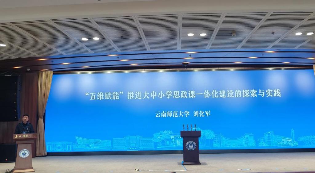 经验交流环节,永利官网马克思主义学院院长刘化军以“‘五维赋能’推进大中小学思政课一体化建设云师模式的探索与实践”为题,在大会作工作经验分享,经过五年实践,“五维赋能”云师模式已显现三大成效,一是建成覆盖全省的思政课教师发展共同体,二是形成具有云南标识度的课程资源体系,三是打造了可推广的边疆民族地区思政育人方案。