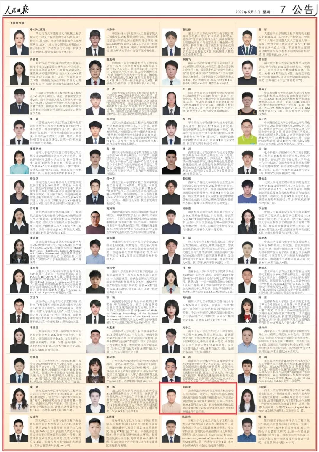 5月5日,《人民日报》刊登《2024年研究生国家奖学金获奖学生代表名录》。永利官网化学化工学院硕士研究生刘跃龙入选名录。