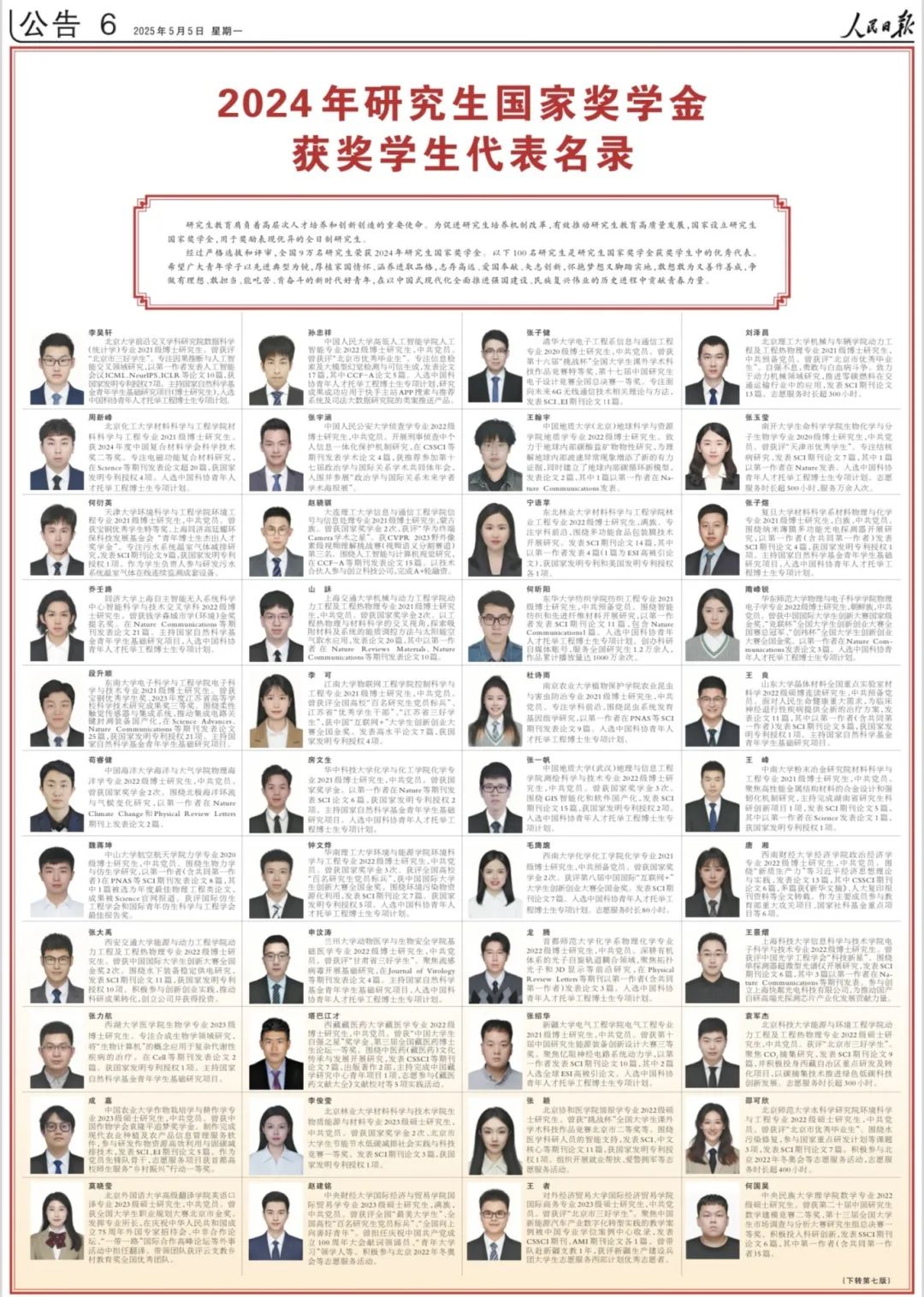 《人民日报》研究生国家奖学金获奖学生代表名录,经过严格选拔和评审,从全国9万名研究生国家奖学金获得者中选拔出100名优秀典型代表。这是近三年内永利官网研究生学子第二次光荣登榜。