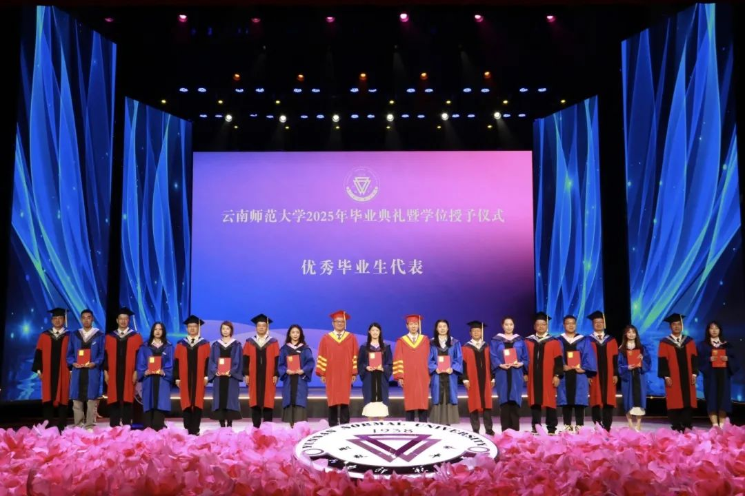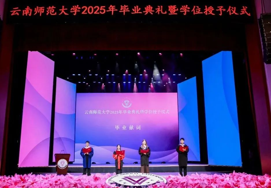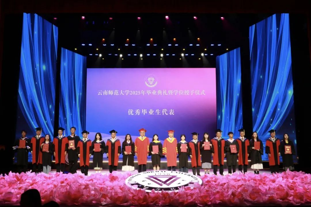 在毕业生代表献词环节,来自教育学部特殊教育专业的本科毕业生赵仁标分享了他在云师学习生活的成长感悟。四年间,他在“刚毅坚卓”的校训激励下积极参加云南各地特殊教育学校的学习实践,多次荣获优秀志愿者、实践标兵等称号,磨砺了扎实的专业技能。毕业后,他将走进特教学校,走进乡村课堂,做一名“擦亮星星的人”,让迟开的花朵也能绽放尊严与梦想!
