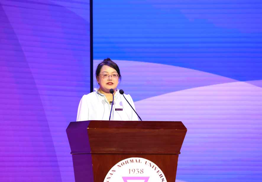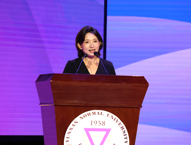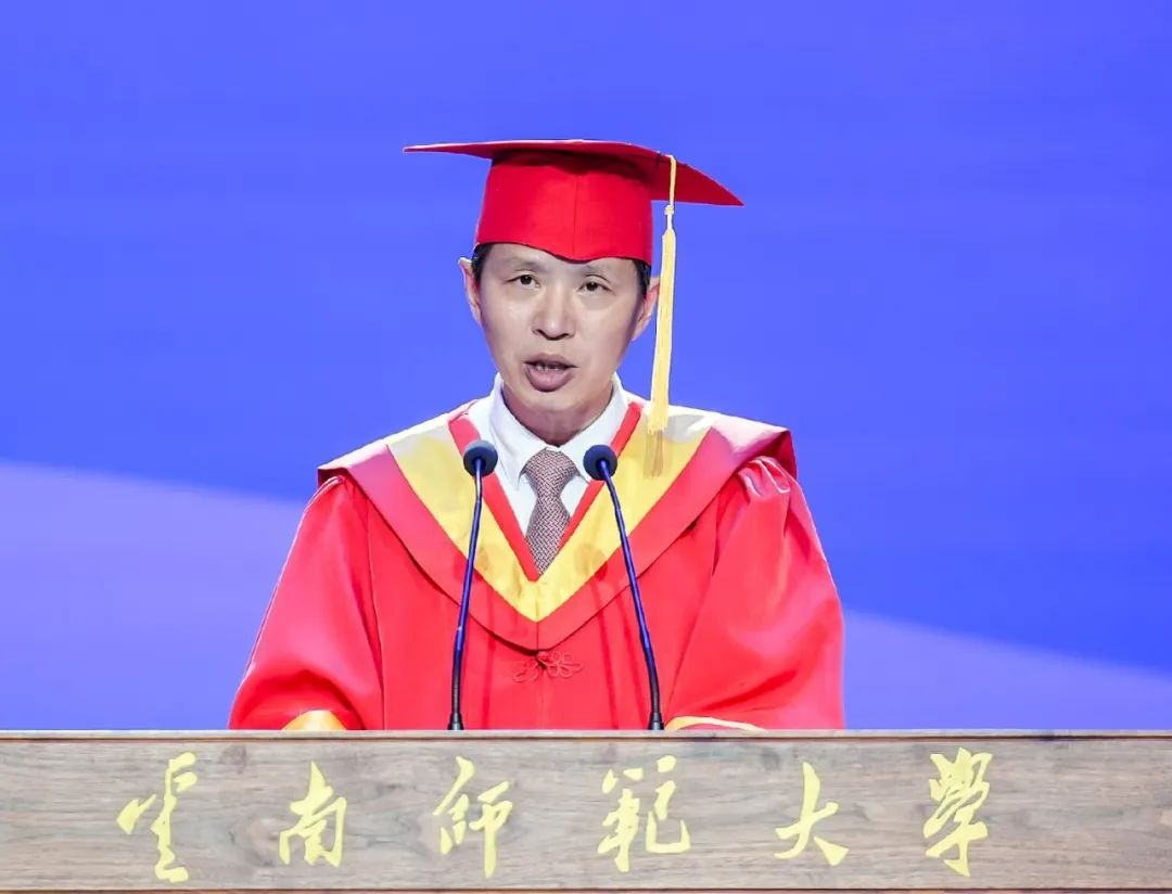 胡金明在致辞中分享了云南师大87年风雨办学历程不同时期的四个故事。第一个故事的主题词是“正义”。西南联大时期,华侨女生甄露茜等联大学子从书生变战士,他们投笔从戎的壮举,不仅体现了爱国情怀,更彰显了对人类正义的深刻理解。希望同学们永葆一颗正义之心,要保有一份社会责任感,关注弱势、维护公平,促进社会公平正义,以正义之心培育未来的社会公民。第二个故事的主题词是“奉献”。上世纪40年代,从西南联大师范学院毕业的广东籍学生谭庆双,毕业后毅然选择留在条件极为艰苦的云南,成为在云南教育界耕耘的一名园丁。联大师院的毕业生,他们把在联大所学带到了云南的中小学教育中,嘉荫长留、润物无声。希望同学们永葆一颗奉献之心,在强国建设、民族伟大复兴的历史进程中,用行动诠释个人的人生价值。第三个故事的主题词是“澹泊”。永利官网教师,著名数学家、教育家朱德祥教授曾说:“我唯一的菲薄贡献是在祖国西南边疆民族地区,率妻子儿女全部从事我一生热爱并为之艰苦奋斗的教育事业,力求不辜负云南人民养育之恩。”朱先生淡泊名利但又追求卓越的品格,赢得学界敬仰。希望同学们永葆一颗澹泊之心,追求人生之美。第四个故事的主题词是“感恩”。2011年,周云丽从丽江华坪女高考入8858cc永利唯一官方网,毕业后她听说母校华坪女高教职人员紧缺,毅然回到母校华坪女高任教。教育改变了她的人生和命运,她怀揣感恩的心去改变一个个如曾经的她的她们。她的选择是张桂梅校长教育理念的延续,也是西南联大师范学院精神的当代回响。希望同学们,特别是工作在教育战线的同学们,永葆一颗感恩之心,践行教育家精神,守护好教育这把弱者向上的“阶梯”。