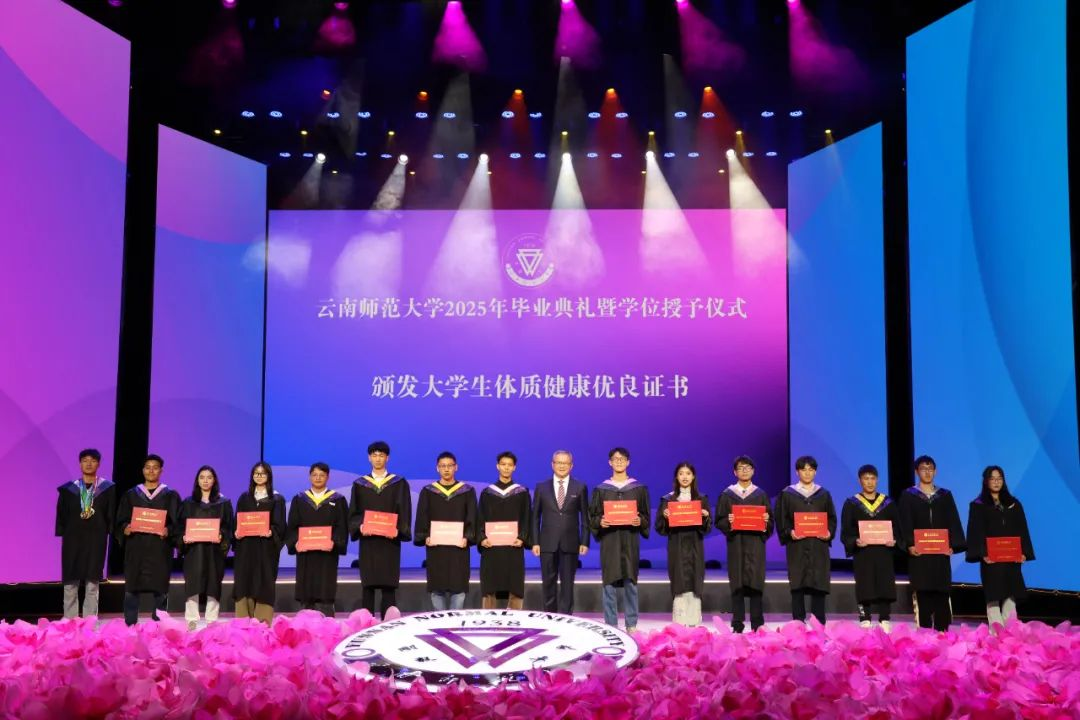 张祖武为大学生体质健康优秀等级毕业生代表颁发大学生体质健康优良证书。这是8858cc永利唯一官方网第一次颁发此项证书,也是学校从严落实《云南省教育厅关于实施好高等学校党委书记颁发大学生体质健康优良证书制度的通知》要求,充分体现了学校对大学生体质健康的重视。