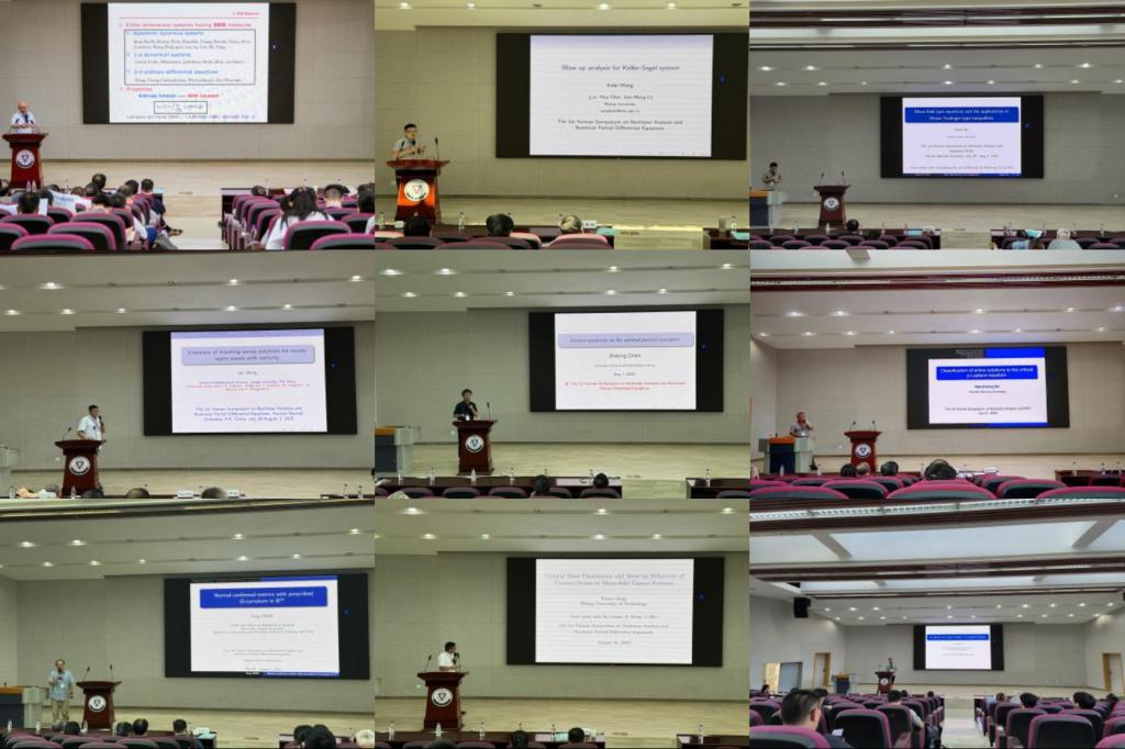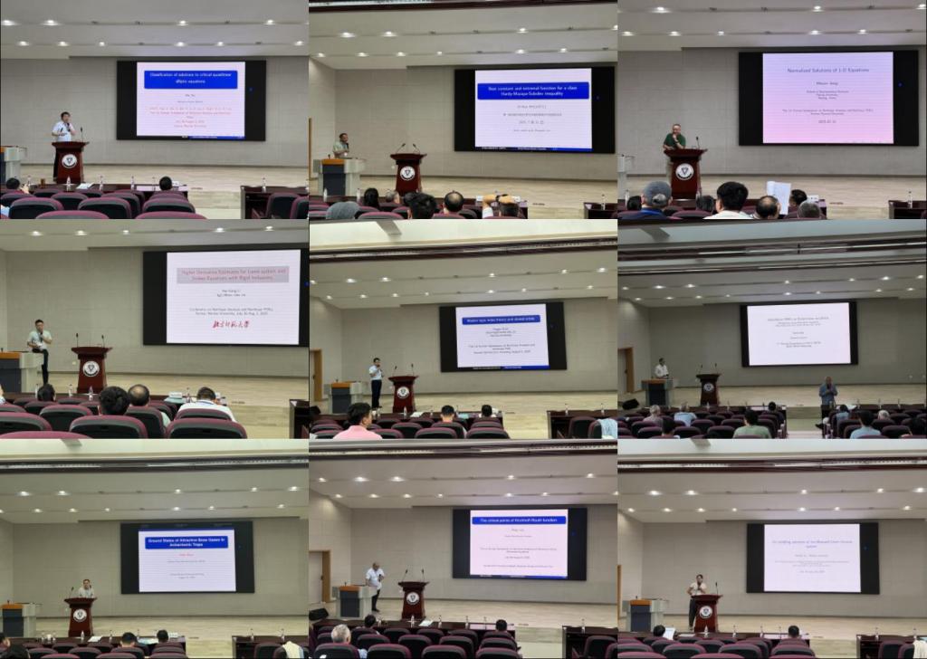 四川大学吕克宁教授,中国科学技术大学麻希南教授、陈世炳教授,北京大学蒋美跃教授,华东师范大学周风教授,华中师范大学郭玉劲教授、罗鹏教授,南开大学段华贵教授,北京师范大学李海刚教授,武汉大学王克磊教授、敖微微教授,武汉理工大学曾小雨教授,江苏大学王俊教授,北京航空航天大学戴蔚教授,浙江师范大学徐甜教授,湘潭大学孙林林教授,中南大学胡烨耀教授,中国科学院数学与系统科学研究院孙黎明副研究员,8858cc永利唯一官方网欧乾忠教授,香港中文大学吴轲博士等国内外专家学者带来了26场高水平学术报告。主题覆盖无穷维动力系统、Hardy-Mazya-Sobolev不等式、Stokes方程、Bose气体的基态、对偶Minkowski问题、Keller-Segel系统等偏微分方程领域的热点领域。