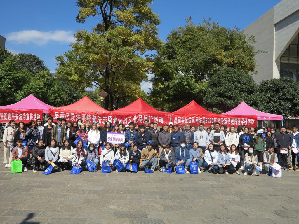 为提高全校师生整体法治意识和安全意识,引导广大师生员工自觉遵法学法守法用法,共同营造安全有序、和谐稳定的校园法治环境,11月6日上午,学校保卫处联合呈贡区委政法委、区法院、区检察院、市公安局呈贡分局、区司法局、团区委、吴家营街道办事处7家单位在呈贡主校区开展法治安全集中宣传活动,呈贡区委政法委副书记王远昆、吴家营街道办事处综治办主任赵果良、保卫处胡兆海处长、汪飞奇副处长全程参加此次活动。