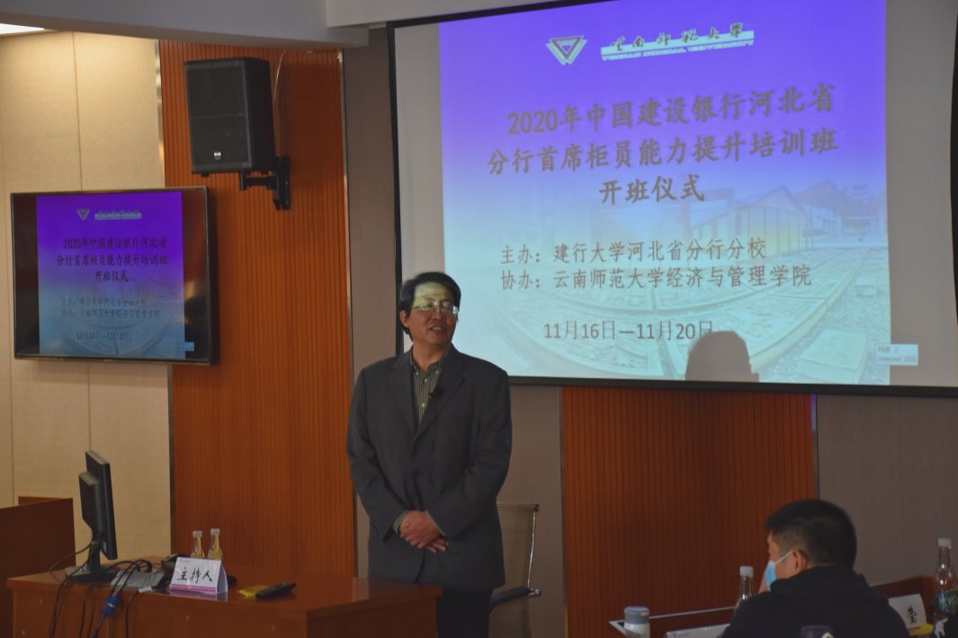 11月16日,由中国建设银行河北省分行、建行大学河北省分行分校主办、8858cc永利唯一官方网经济与管理学院协办的2020年中国建设银行河北省分行首席柜员能力提升培训班在永利官网开班。经济与管理学院联系领导李国疆、学院党委书记华致雄、院长张广斌、党委副书记赵显辉出席了开班仪式。仪式由学院副院长常志有主持。