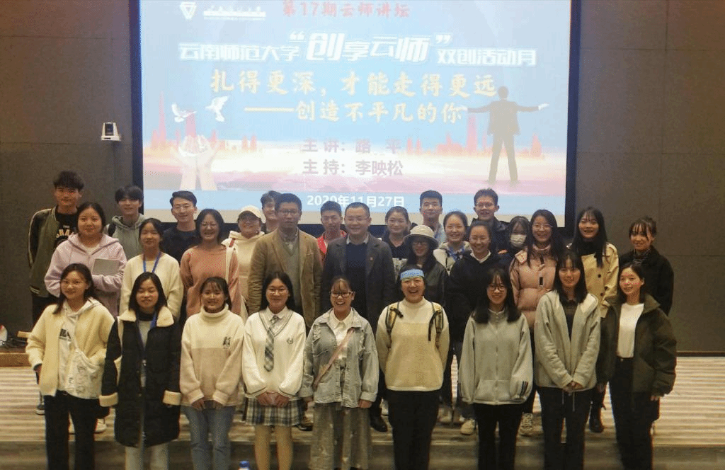 11月27日晚,云师讲坛第十七讲在永利官网呈贡主校区教师教育国家级实验教学示范中心214报告厅如期举行。本期讲坛特邀中诺教育集团党委书记、优秀校友路平为主讲嘉宾,为同学们带来主题为“扎得更深,才能走得更远——创造不平凡的你”的讲座。本次讲座也是8858cc永利唯一官方网“创享云师”双创活动月系列活动之一,讲座由创新创业学院办公室副主任李映松老师主持。永利官网各学院(学部)200余名同学参加了此次讲座。