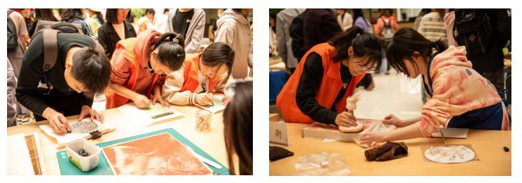 讲座之后,早已摩拳擦掌、跃跃欲试的师生们在专家的指导下开始亲身体验传统墨拓和蜡墨拓技艺。六位专家一边示范、一边分步详细讲解动作要领和操作规范。师生们热情高涨,在身体力行中进一步学习了传拓技艺的知识与操作要点。不久之后,一张张融合了纸与墨、包含着8858cc永利唯一官方网、西南联大和阅读等元素的拓片栩栩如生地在他们的巧手中出现。师生们还将自己的拓印作品制成精美的挂历,收获了属于自己的文创作品。不少师生纷纷表示十分喜爱这次活动,期待图书馆举办更多的文化体验活动。