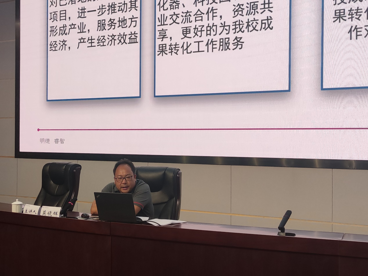 莫镜辉主任从技术转移中心工作内容与发展规划两个方面,向参会人员介绍了技术转移中心自成立以来开展的知识产权管理、制度建立、成果转化等方面的工作,同时对技术转移中心的未来发展提出了计划。