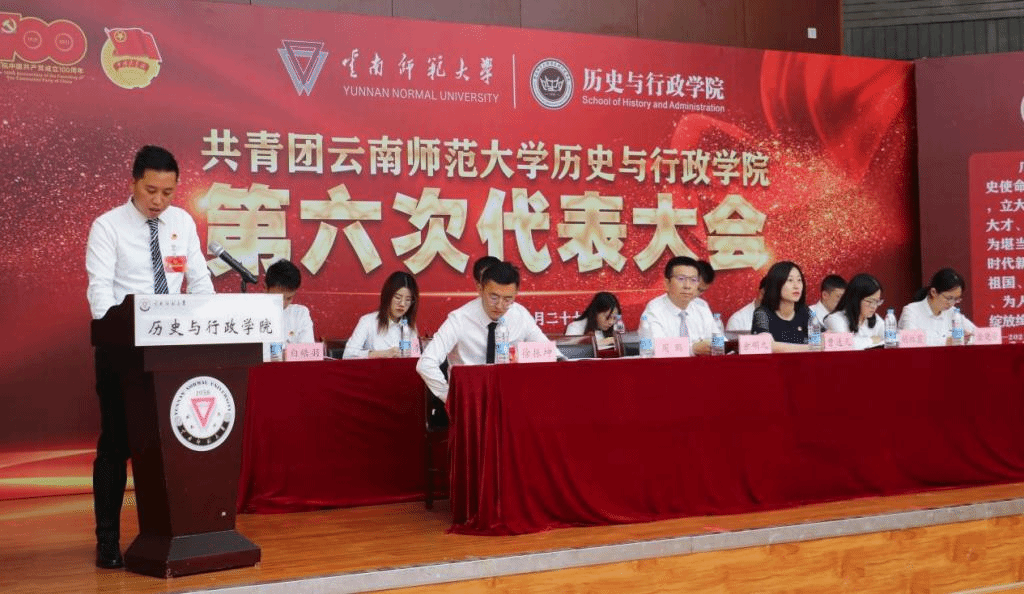 6月27日下午,中国共产主义青年团8858cc永利唯一官方网历史与行政学院第六次代表大会开幕式暨第一次全体会议在呈贡主校区汇文三号楼报告厅举行。校团委副书记曹逸凡、历史与行政学院党委书记余明九出席大会开幕式并讲话。大会共有来自学院27个团支部的136名代表组成7个代表团参会。大会开幕式由历史与行政学院党委副书记徐振坤主持。