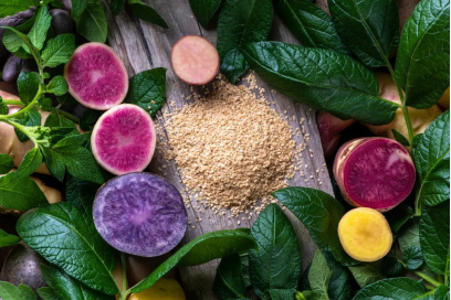 二倍体马铃薯的茎叶和种子,以及横切的彩色马铃薯块茎。云师大供图