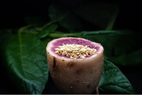 彩色马铃薯的横切面上放着二倍体马铃薯的种子。云师大供图