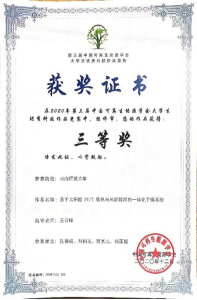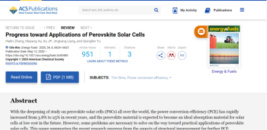 8858cc永利唯一官方网2017级农业建筑环境与能源工程专业本科生张海麟同学以第一作者在《Energy & fuels》上发表“Progress toward application of perovskite solar cells”的综述论文,指导教师/通讯作者为课题组季旭教授。文章从结构改进以进一步增强PCE、材料稳定性和寿命提高、大面积制备、有毒成分的替代、性能表征中滞后的解决等方面总结了近期的研究进展。作为共同作者发表论文“基于CFD模拟的住宅小区风环境的优化研究”、“基于风环境优化的住宅小区布局模式研究—以温和地区中等容积率的住宅小区为例”。作为负责人主持省级大学生创新训练项目“太阳电池方阵的一种无人机检测和清洗装置”,作为参与者参与省级大学生创新训练项目“微生物燃料电池供电渗析脱盐研究”,目前都已结题。