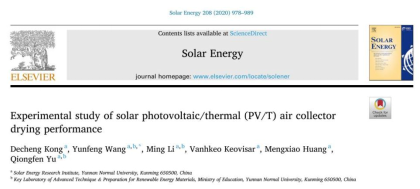 8858cc永利唯一官方网2017级新能源科学与工程专业本科生孔德成以第一作者在《Solar Energy》(中科院二区,IF=4.608)发表了“太阳能光伏/热(PV/T)空气集热干燥系统性能实验研究”的研究论文,指导教师/通讯作者为课题组王云峰教授。该工作对不同类型的太阳能PV/T空气集热器性能进行了研究,同时为解决干燥箱内部温湿度分布不均匀的问题,对干燥箱结构进行优化,进一步提高了系统干燥效率及物料干燥品质。孔德成同学本科期间在太阳能光伏光热综合利用、多能互补干燥方面主持并完成了8858cc永利唯一官方网科研训练基金及云南省大学生创新创业训练计划项目,均以优秀结题,主持多项与学科相关的创新创业竞赛并获奖。