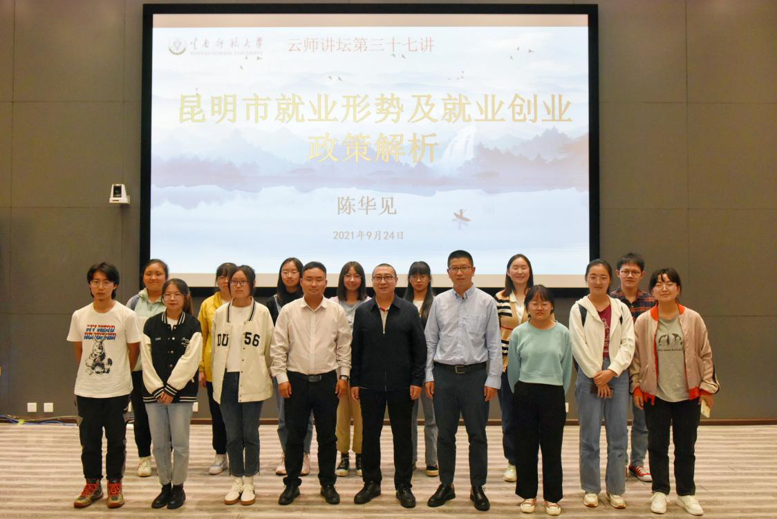 陈华见处长直奔主题,他从昆明市高校毕业生就业总体形势、云南省和昆明市重点发展产业、就业和创业政策介绍及针对在校大学生的几点建议四个方面展开讲座。他运用大量的数据、统计图表,对影响毕业生就业创业的各种因素进行了深刻论述。他提出,就业创业工作面临严峻挑战的同时,“危中有机”,昆明市也面临良好的发展机遇,如区位优势、外部有利环境及国内环境等。另外,云南省的“十四五”重点发展行业、“三张牌”、“五网”建设和食品“八大产业”等,也都是政府主导的发展方向。他强调,要用变化的眼光看问题,才有可能抓住发展机遇。陈华见老师的讲座,内容全面、信息量大、案例丰富,引发同学们对于就业创业和职业生涯规划的思考。