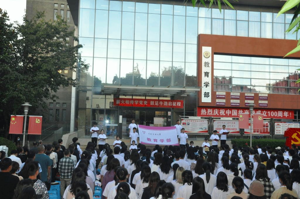 2021级课程与教学论专业研究生胡嘉康带领全体新生郑重宣誓:“我是中国青年,我是祖国忠诚的儿女,先辈夙愿在胸,复兴大任在肩,今天面对国旗,我们庄严承诺:奋斗有我,让人民更加幸福,奋斗有我,让家园更加美好,奋斗有我,让祖国更加昌盛!百年传承,今日到我,青春向党,奋斗强国!”