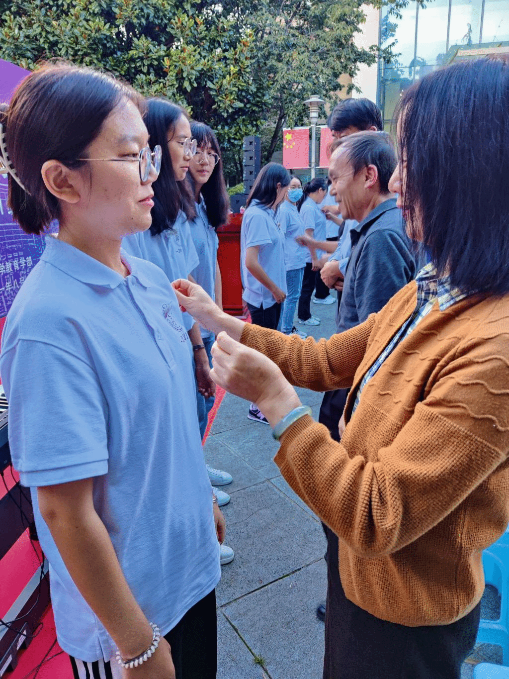 2019级高等教育学专业硕士研究生黄小宾作为在校生代表发言。他分享了入学两年来的体会,希望学弟学妹们能够秉承“刚毅坚卓”的校训,认真学习专业知识,强健体魄,不虚度大学四年时光。2021级教育学专业本科生朱瑞作为新生代表发言。她表达了对8858cc永利唯一官方网、对教育学部、对教育学专业的热爱,并表示在今后的四年大学学习生活中会“勤于实践,积累经验,笃行致远”,真正践行“刚毅坚卓”的校训。随后,教师代表为2021级新生代表佩戴校徽。