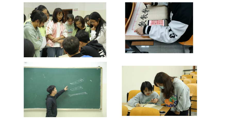在欧楷班,胡景瑞同学讲解了欧楷的尖横、短横、长横怎么去写,应该如何运用尖横、短横、长横去书写“三”字;在颜楷班,禹家恒同学为同学们介绍了颜楷的特点及代表作家的碑帖,毛笔的开笔和洗笔等步骤,邬海飞同学介绍了握笔方法和颜真卿的两种碑帖,并让同学们选择一种碑帖去临摹;在隶书班,王怡潇同学讲解了隶书的基本笔画,有隶书的逆峰起笔、短横点、折基本写法等。随后,同学们开始练习,书法协会的负责同学指导示范。书法练习活动共持续两个小时,各位同学认真听讲、积极配合,专心致志练习书法。多数同学都是刚始接触毛笔字练习,在同学的耐心讲解下有条不紊地进行练习,取得较好效果。