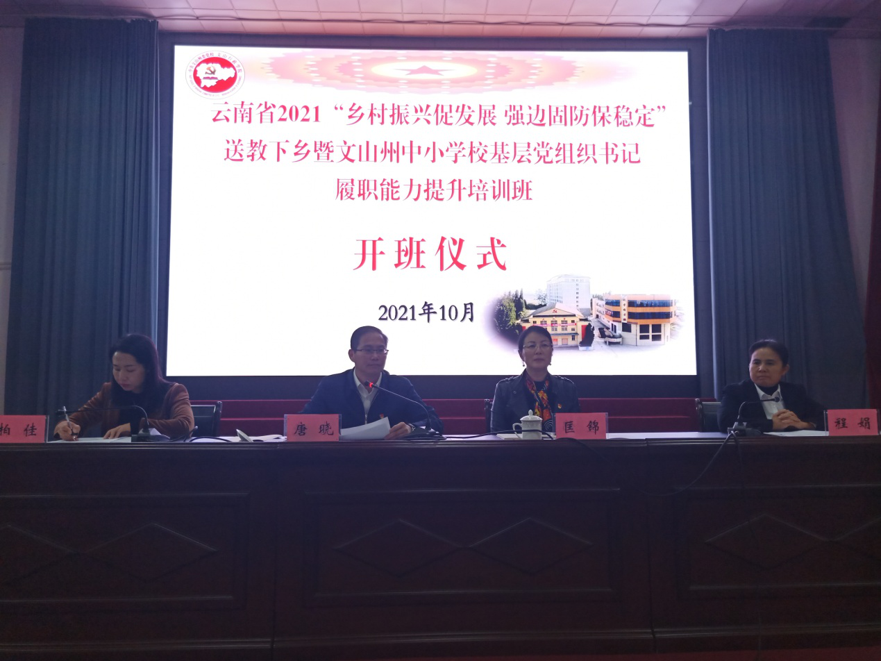 根据省委组织部干部调训工作安排,10月16日上午,由永利官网云南西南联大干部教育学院承办的“云南省2021年‘乡村振兴促发展 强边固防保稳定’送教下乡暨文山州中小学校基层党组织书记履职能力提升培训班”在文山州委党校顺利开班。云南西南联大干部教育学院专职副院长匡锦,文山州委组织部副部长唐晓,州委教育工委专职副书记、州教育体育局党组成员柏佳出席开班式。开班式由文山州委党校副校长程娟主持。来自文山市、砚山县、西畴县、麻栗坡县、广南县5个县(市)委教育工委干部和部分中小学校(幼儿园)党组织书记、校长,州直各学校党组织党务干部,共计250余人参加了开班仪式。
