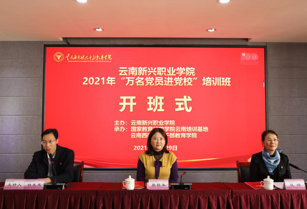 国家教育行政学院云南培训基地办公室主任、云南西南联大干部教育学院专职副院长匡锦出席开班式并致辞,云南新兴职业学院党委书记张毅永作开班动员和培训总结讲话。国家教育行政学院云南培训基地办公室副主任、云南西南联大干部教育学院副院长铁发宪主持开班式和结业式。云南新兴职业学院领导班子成员以及90余名党员参加了培训。