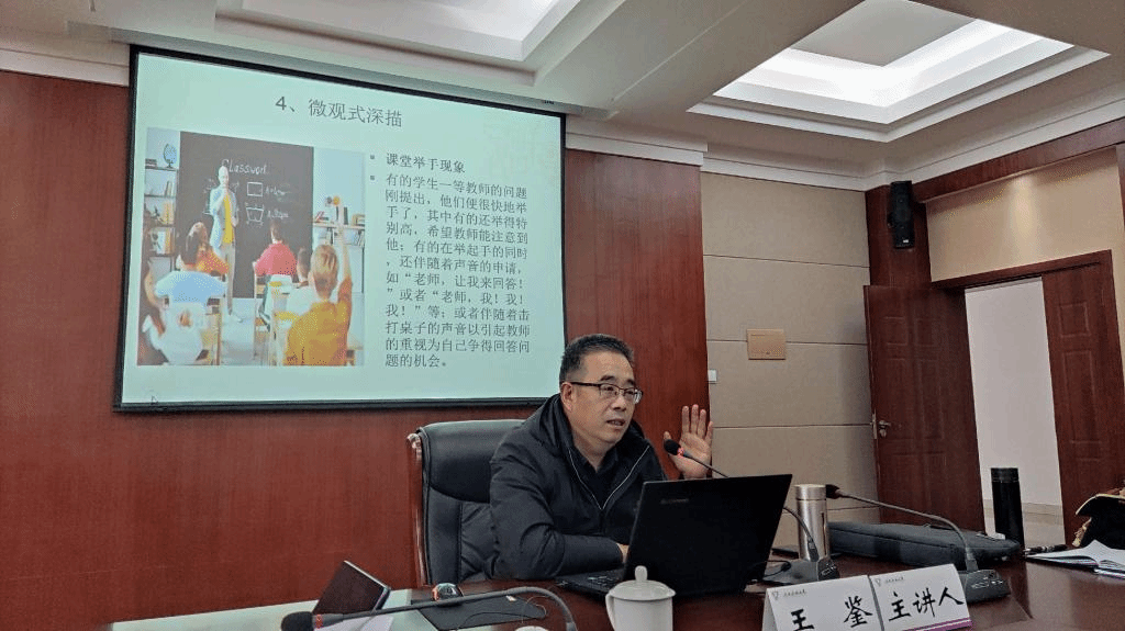 王鉴教授指出,“深描”是人文社会科学创作与研究中的一种方法,是通过语言详尽地描述,呈现事件的细节,还原事件真相,让读者身临其境的研究方法,它能较好地体现人文社会科学的研究特点,在教育研究中体现出其独特性。随后,王教授对“深描”这一研究方法的缘起、发展与应用等进行了层层剖析。他从艺术、文学、历史创作中的“深描”入手,对“深描”这一研究方法的认知演变和发展历程进行了深入阐释,通过《高高举起的右手》等生动有趣的案例阐释了“情境式深描”“传记式深描”“关系式深描”和“微观式深描”等不同类型的差异性特点及其在教育研究中的应用情境和表现形式。王教授强调,在田野研究或课堂研究中,研究者的观察、访谈、深描、解释组合使用形成民族志或课堂志,在研究方法综合取向时,使用“深描”要注意“三角互证”,不可过度依赖某一种研究方法。