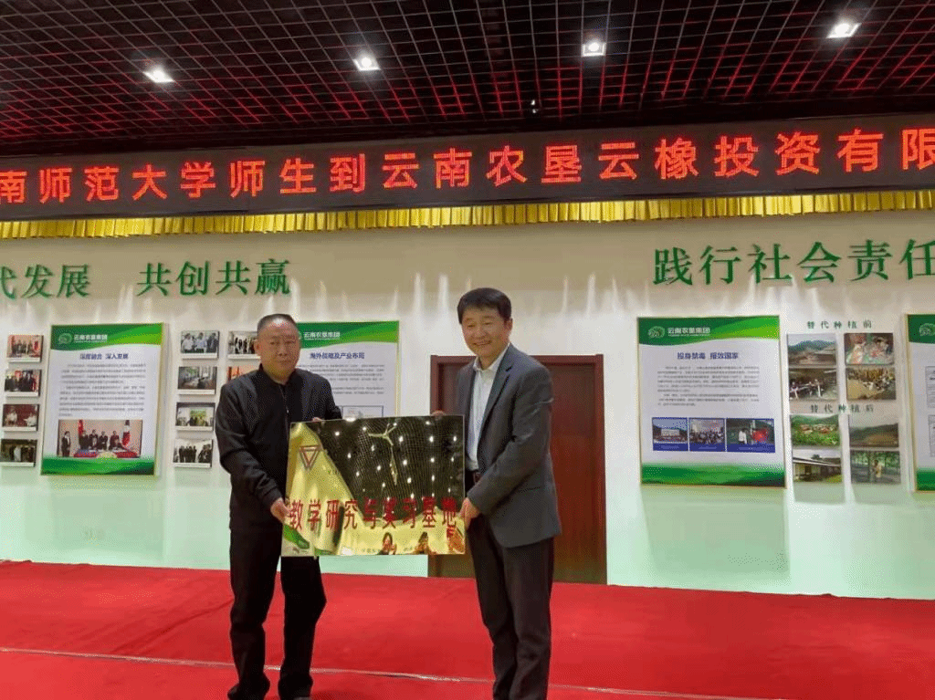 座谈结束后,云南华文学院黄启庆副院长和云南农垦云橡投资有限公司李孝伟总经理共同为“8858cc永利唯一官方网教学研究与实习基地”揭牌。