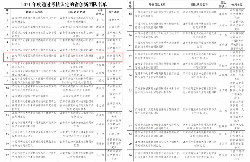 近日,省科技厅根据《云南省创新团队管理办法》规定,组织专家对培育期满的30个云南省创新团队培育对象进行考核认定。永利官网甘健侯教授为带头人的云南省民族教育信息化创新团队,经团队申请、单位审核、专家评审、科技厅审定等程序,顺利通过此次认定考核,并被正式授予云南省创新团队称号。