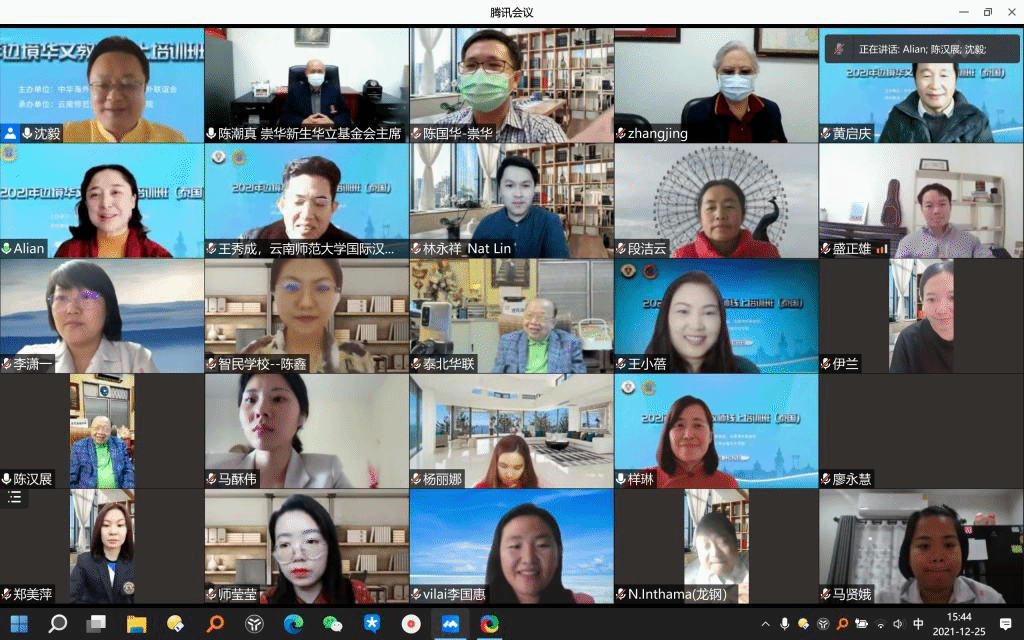 12月25日,由中华海外联谊会、云南海外联谊会主办,永利官网云南华文学院承办的2021年边境华文教师线上培训班(泰国)结业仪式顺利举行,泰国清迈崇华新生华立学校、南邦美速智民学校、北揽坡同德学校领导,云南华文学院党委书记和雪莲、院长王秀成、相关院领导,汉语国际教育推广师资培训基地相关负责人、授课教师代表及所有参训学员参加了结业仪式。仪式由汉语国际教育推广师资培训基地常务副主任沈毅教授主持。