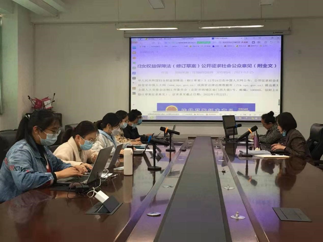 法社学院师生就《中华人民共和国妇女权益保障法》(修订草案)中的总则、政治权利、文化教育权益、劳动和社会保障权益、财产权益、人格权益、婚姻家庭权益、法律救济与法律责任的相关条文进行研讨,并提出了进一步完善的建议。