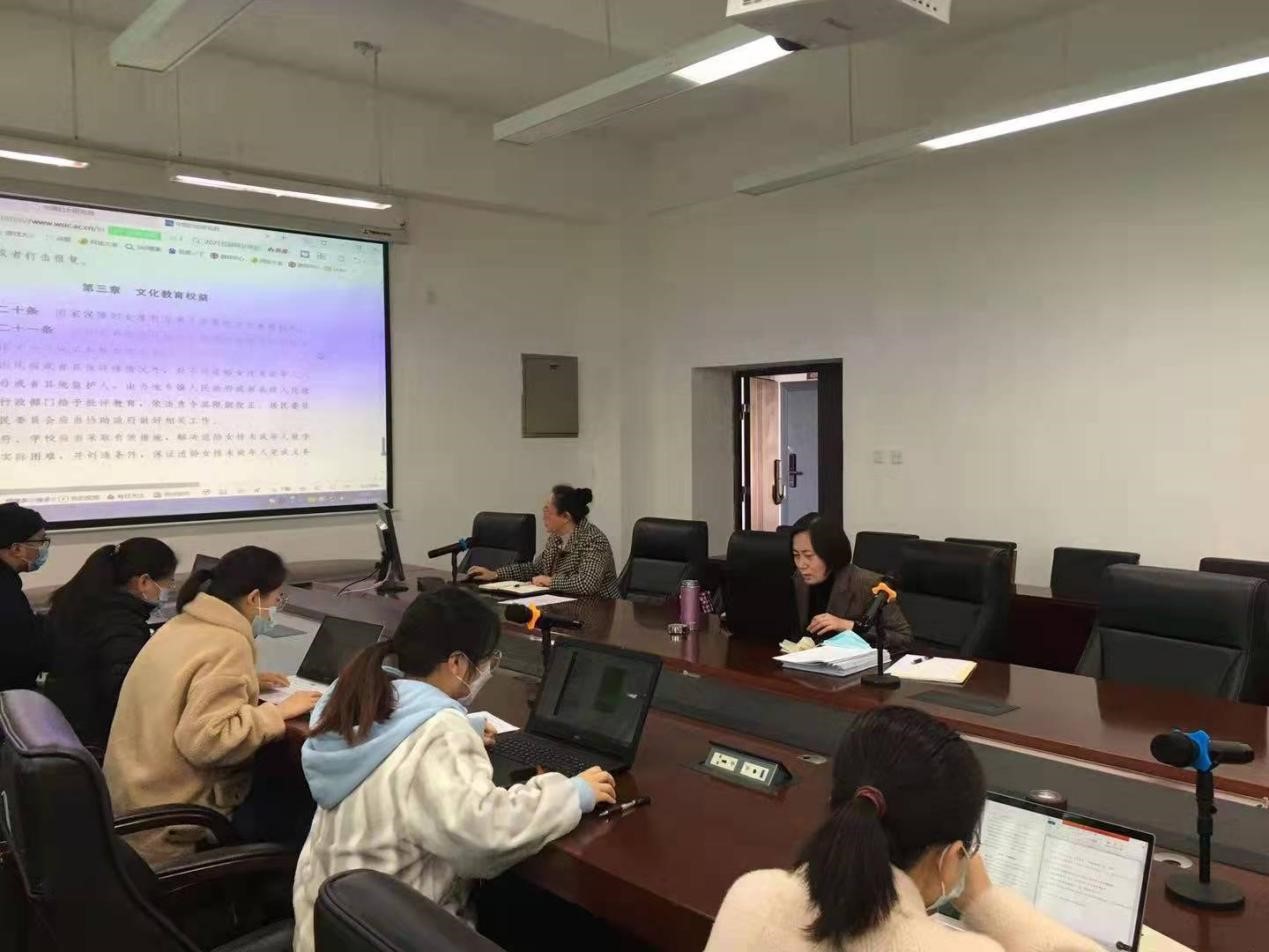 2021年12月30日上午,8858cc永利唯一官方网妇联组织的《中华人民共和国妇女权益保障法》(修订草案)意见征求座谈会在呈贡校区明德一号楼室顺利举行,永利官网妇联副主席杨九迎、法学与社会学学院法律系副教授杜爱萍以及七名法律专业研究生参会。会议由杨九迎副主席主持。