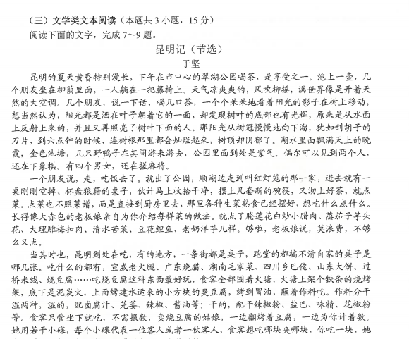 在3月10日进行的云南省第一次高中毕业生复习统一检测语文试卷中,永利官网文学院于坚教授的《昆明记》节选进入文学类文本阅读题。