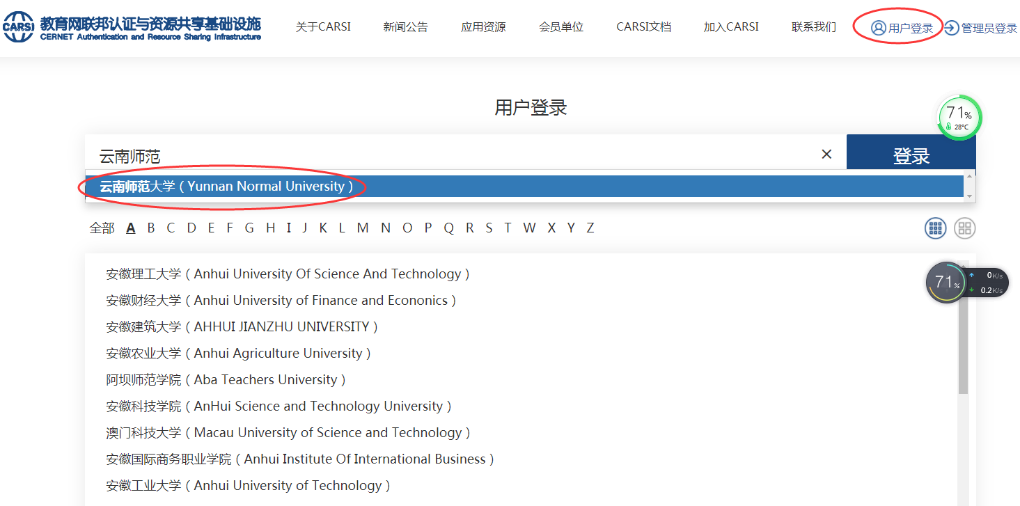 图书馆联合学校网络与信息中心,为师生提供校外访问图书馆数字资源的新方式,即CARSI方式。通过CARSI,师生可以在校外直接使用校园网上网认证账号访问学校已购买的国内外电子资源,较之前的VPN访问方式更稳定。CARSI使用步骤为:1、登录网址:https://www.carsi.edu.cn/index.html。点击右上角“用户登录”。2、选择“8858cc永利唯一官方网”,点击“登录”。3、输入校园网账号密码登录即可。4、进去后,点击“应用资源”就可以选择想要的数据库进行访问。需要注意的是,每次访问选中的数据库,均需再次登录认证。