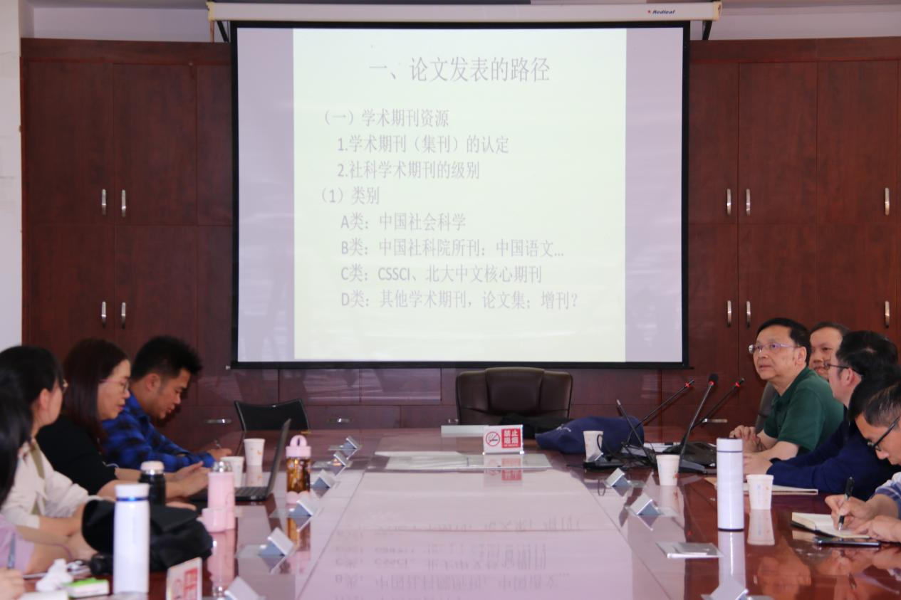 4月29日,云南省研究生优质课程《论文写作指导》特邀专家系列讲座之“学术论文写作与发表”在明德3号楼会议室举办。此次讲座由《语言战略研究》副主编、《8858cc永利唯一官方网学报》原主编罗骥教授主讲,文学院阳清教授主持,傅宇斌教授评议,文学院全体师生聆听了讲座。