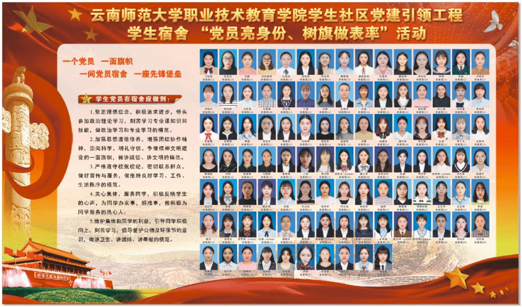 为深入推进思想政治工作进学生社区,加强党建引领,充分发挥党员先锋模范作用,全面提升思政育人实效,5月13日,职业技术教育学院在一二·一西南联大校区组织开展“党员亮身份 树旗做表率”学生党员宿舍挂牌活动。学院党委书记刘虹,副书记向斯楠,支部书记、辅导员及党员宿舍代表参加了活动。