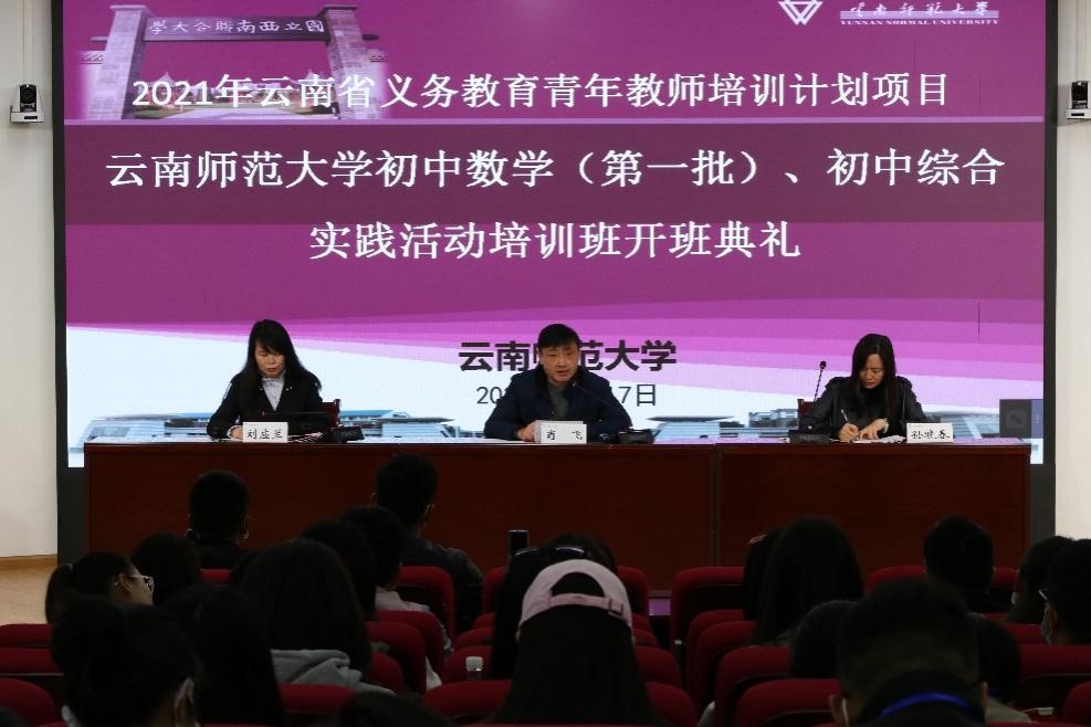 5月17日上午,由继续教育学院承办的2021年云南省义务教育青年教师培训计划初中数学(第一批)、初中综合实践活动培训班,在永利官网一二·一西南联大校区明达楼举行开班仪式。为积极落实疫情常态化防控工作部署,开班仪式采取线上线下同步进行的方式,主会场设在明达楼一楼报告厅,分会场设在明达楼302、402教室。继续教育学院党委书记肖飞,副院长刘应兰,初中综合实践活动学科首席专家孙晓春副教授,项目管理团队以及来自全省16个州市的200名参训教师参加开班仪式。仪式由继续教育学院刘应兰副院长主持。